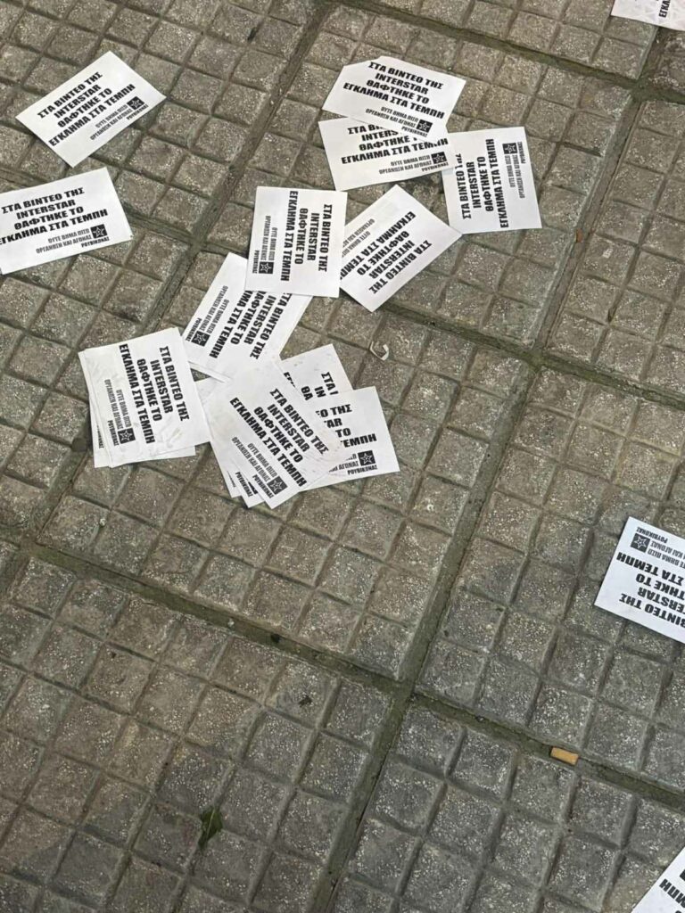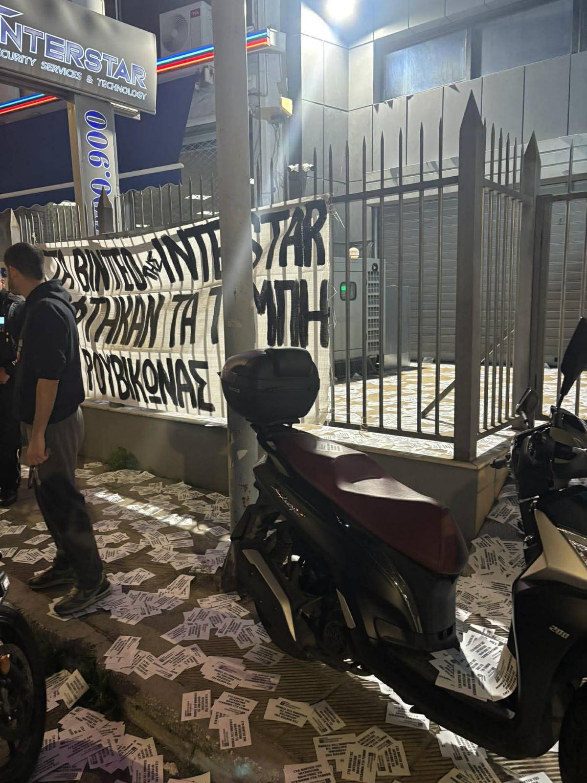 Συμβολική παρέμβαση με τη συμπλήρωση τριών ετών από τα Τέμπη, με πανό και συνθήματα πραγματοποίησε ο “Ρουβίκωνας” την Παρασκευή το βράδυ στα γραφεία της εταιρείας Interstar.