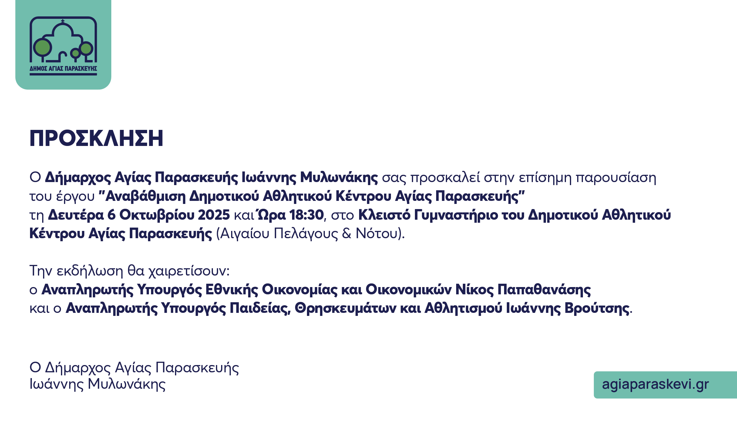 Η επίσημη παρουσίαση του έργου “Αναβάθμιση Δημοτικού Αθλητικού Κέντρου Αγίας Παρασκευής” θα γίνει τη Δευτέρα 6 Οκτωβρίου 2025 στις 6.30 μμ στο Κλειστό Γυμναστήριο του Δημοτικού Αθλητικού Κέντρου Αγίας Παρασκευής (Αιγαίου Πελάγους & Νότου).