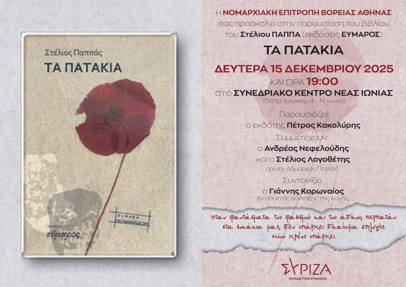 Η ΝΕΒΑ ΣΥΡΙΖΑ – ΠΡΟΟΔΕΥΤΙΚΗ ΣΥΜΜΑΧΙΑ προσκαλεί τα μέλη και του φίλους του κόμματος στην παρουσίαση του βιβλίου του Στέλιου Παππά “Τα Πατάκια”. Η εκδήλωση θα πραγματοποιηθεί τη Δευτέρα, 15 Δεκεμβρίου 2025 και ώρα 7.00′ μ.μ., στο Συνεδριακό Κέντρο του Δήμου Ν. Ιωνίας (Πατριάρχου Ιωακείμ 4, δίπλα στον σταθμό του ΗΣΑΠ).