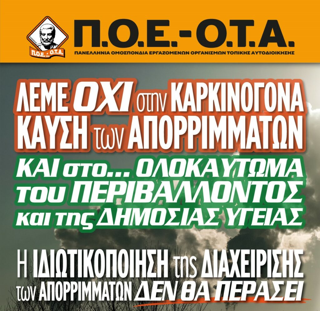 Η Πανελλήνια Ομοσπονδία Εργαζομένων Οργανισμών Τοπικής Αυτοδιοίκησης (Π.Ο.Ε.-Ο.Τ.Α.), με τη σειρά της, καταγγέλλει το κυβερνητικό σχέδιο δημιουργίας έξι εργοστασίων καύσης απορριμμάτων στην Ελλάδα, θεωρώντας το επικίνδυνο για το περιβάλλον και τη δημόσια υγεία.
