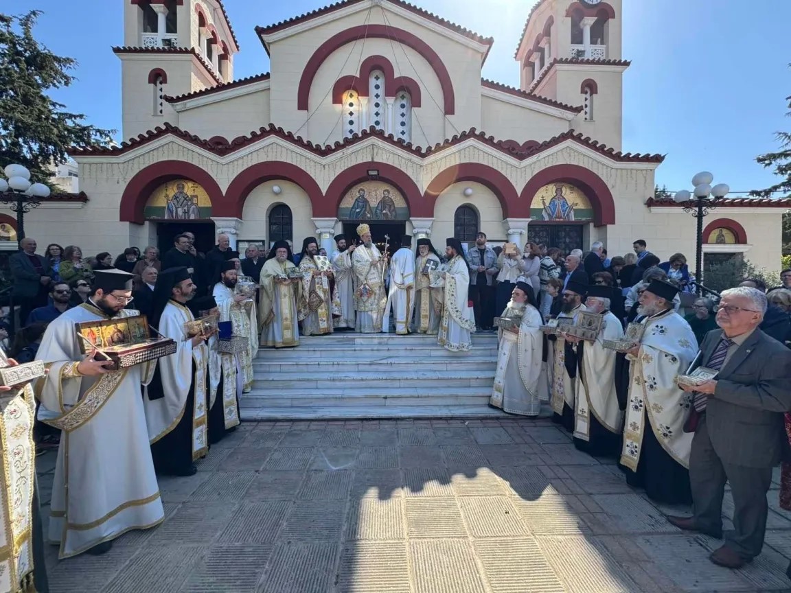 Ακολούθησε Ιερά Λιτάνευση της θαυματουργού εικόνας της Παναγίας Διασωζούσης και των Ιερών Λειψάνων, με τη συμμετοχή πλήθους πιστών.