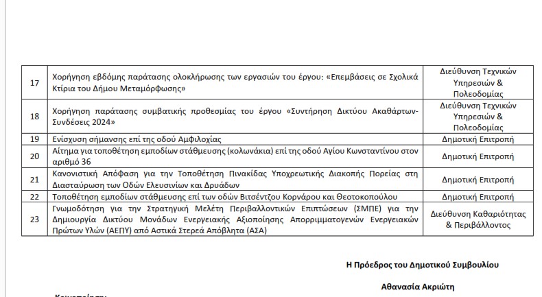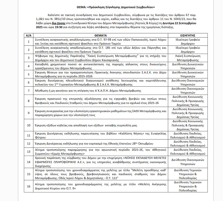 Τη Δευτέρα 22 Σεπτεμβρίου 2025 συνεδριάζει το ΔΣ της Μεταμόρφωσης, στο Συνεδριακό Κέντρο του Δήμου στις 7.30 μμ.