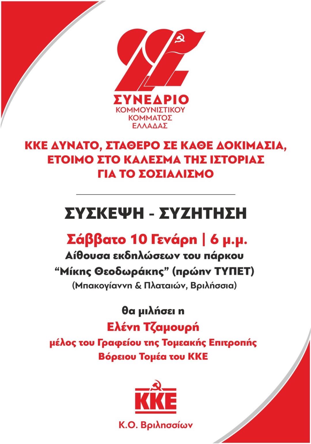 Προσυνεδριακή σύσκεψη, ενόψει του 22ου Συνεδρίου του κόμματος, πραγματοποιεί η Κ.Ο. Βριλησσίων του ΚΚΕ.