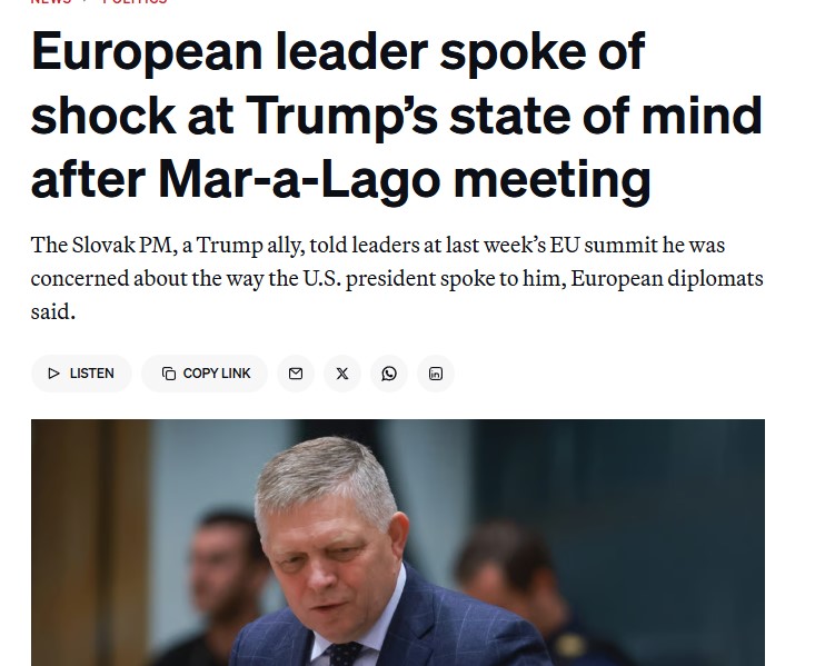 Καταγγέλει την ειδησεογραφική ιστοσελίδα Politico ο πρωθυπουργός της Σλοβακίας Ρόμπερτ Φίτσο για το δημοσίευμά της ότι εκμυστηρεύτηκε σε άλλος Ευρωπαίους πρωθυπουργούς ότι είδε τον Τραμπ σε “περίεργη ψυχική κατάσταση” από τον τρόπου που του μιλούσε