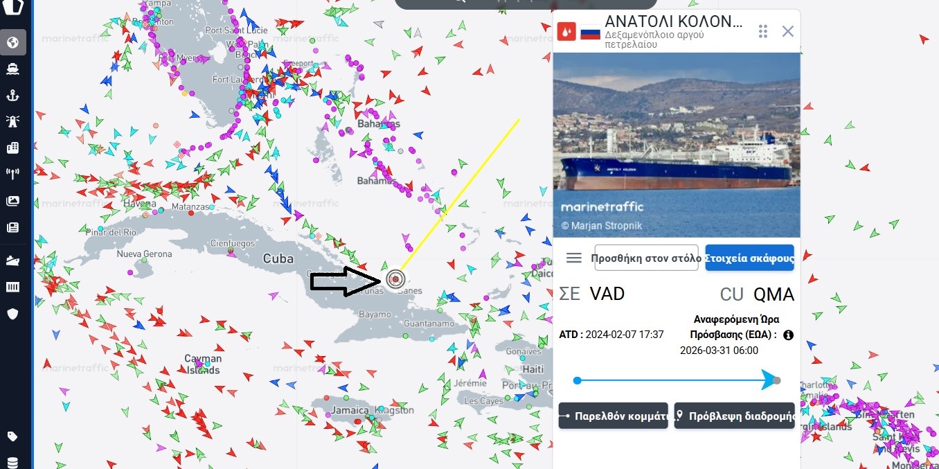 Το ρωσικό δεξαμενόπλοιο Anatoly Kolodkin, το οποίο μεταφέρει περίπου 730.000 βαρέλια αργού πετρελαίου, πλησιάζει τα χωρικά ύδατα της Κούβας και θα μπορούσε να φτάσει στο λιμάνι του Matanzas μέχρι την Τρίτη, σύμφωνα με τις υπηρεσίες παρακολούθησης πλοίων.