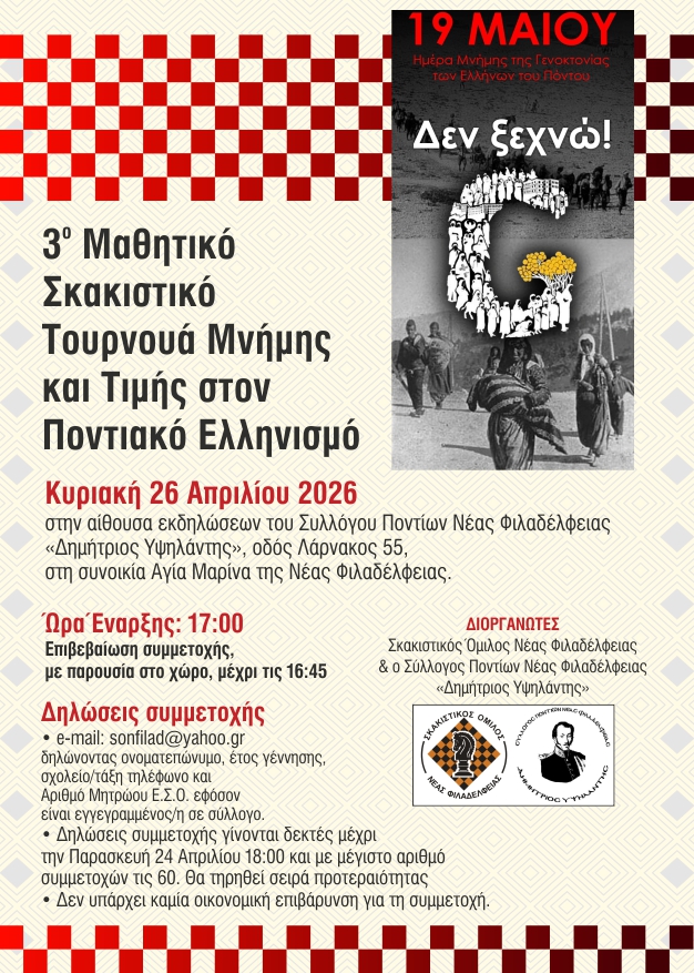 Την Κυριακή 26 Απριλίου 2026 θα πραγματοποιηθεί το 3ο Τουρνουά Μνήμης και Τιμής στον Ποντιακό Ελληνισμό που διοργανώνουν ο Σ.Ο.Ν.Φ. και ο Σύλλογος Ποντίων Νέας Φιλαδέλφειας “Δημήτριος Υψηλάντης”. Το τουρνουά, το οποίο είναι ενταγμένο στη σειρά “100 σκακιστικά τουρνουά για τα 100 χρόνια της Νέας Φιλαδέλφειας – Νέας Χαλκηδόνας”, θα πραγματοποιηθεί στο οίκημα του Συλλόγου Ποντίων Νέας Φιλαδέλφειας “Δημήτριος Υψηλάντης”, στην οδό Λάρνακος 55, στη συνοικία της Αγίας Μαρίνας, στη Νέα Φιλαδέλφεια με ώρα έναρξης τις 5.00′ μ.μ.