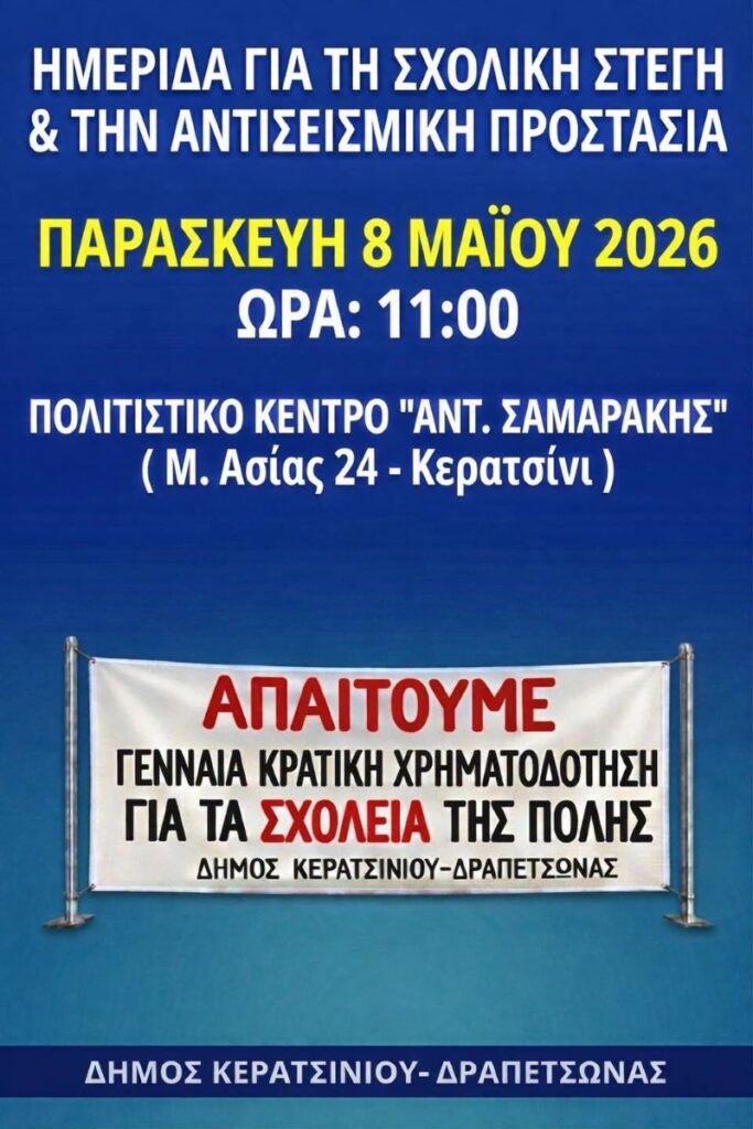 Ημερίδα με τίτλο “Σχολική στέγη και αντισεισμική προστασία” διοργανώνει ο Δήμος Κερατσινίου – Δραπετσώνας. Η ημερίδα που είναι ενταγμένη στο πλαίσιο δράσεων του Δήμου για τη σχολική στέγη θα λάβει χώρα την Παρασκευή 8 Μαΐου 2026, στις 11.00′ π.μ. στο πολιτιστικό κέντρο Αντ. Σαμαράκης.