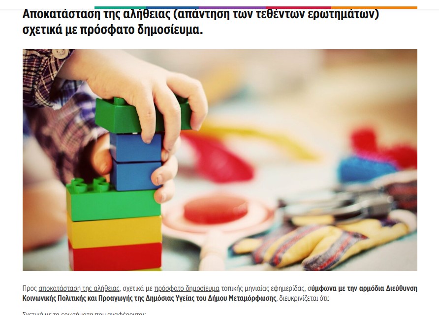Προς αποκατάσταση της αλήθειας, σχετικά με πρόσφατο δημοσίευμα τοπικής μηνιαίας εφημερίδας, σύμφωνα με την αρμόδια Διεύθυνση Κοινωνικής Πολιτικής και Προαγωγής της Δημόσιας Υγείας του Δήμου Μεταμόρφωσης, διευκρινίζεται ότι: