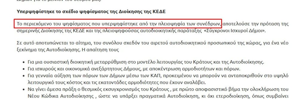 Εκτός από τον συκοφαντικό τίτλο για τις άλλες παρατάξεις αναφέρει και ψέματα: Γράφει πως το ψήφισμα Κυρίζογλου υπερψηφίστηκε από την πλειοψηφία των συνέδρων ενώ η αλήθεια είναι ότι η πλειοψηφία ψήφισε τα άλλα δύο ψηφίσματα.