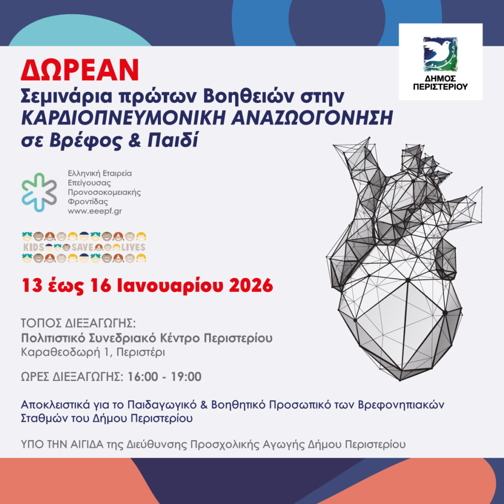 Το σεμινάριο θα πραγματοποιηθεί από 13 έως και 16 Ιανουαρίου 2026, στην Αίθουσα Πολλαπλών Χρήσεων του Δημαρχιακού Μεγάρου Περιστερίου, από την Ελληνική Εταιρεία Επείγουσας Προνοσοκομειακής Φροντίδας(ΕΕΕΠΦ), σε συνεργασία με τη νοσηλεύτρια κα Φραντζή, υπάλληλο της Διεύθυνσης Προσχολικής Αγωγής.
