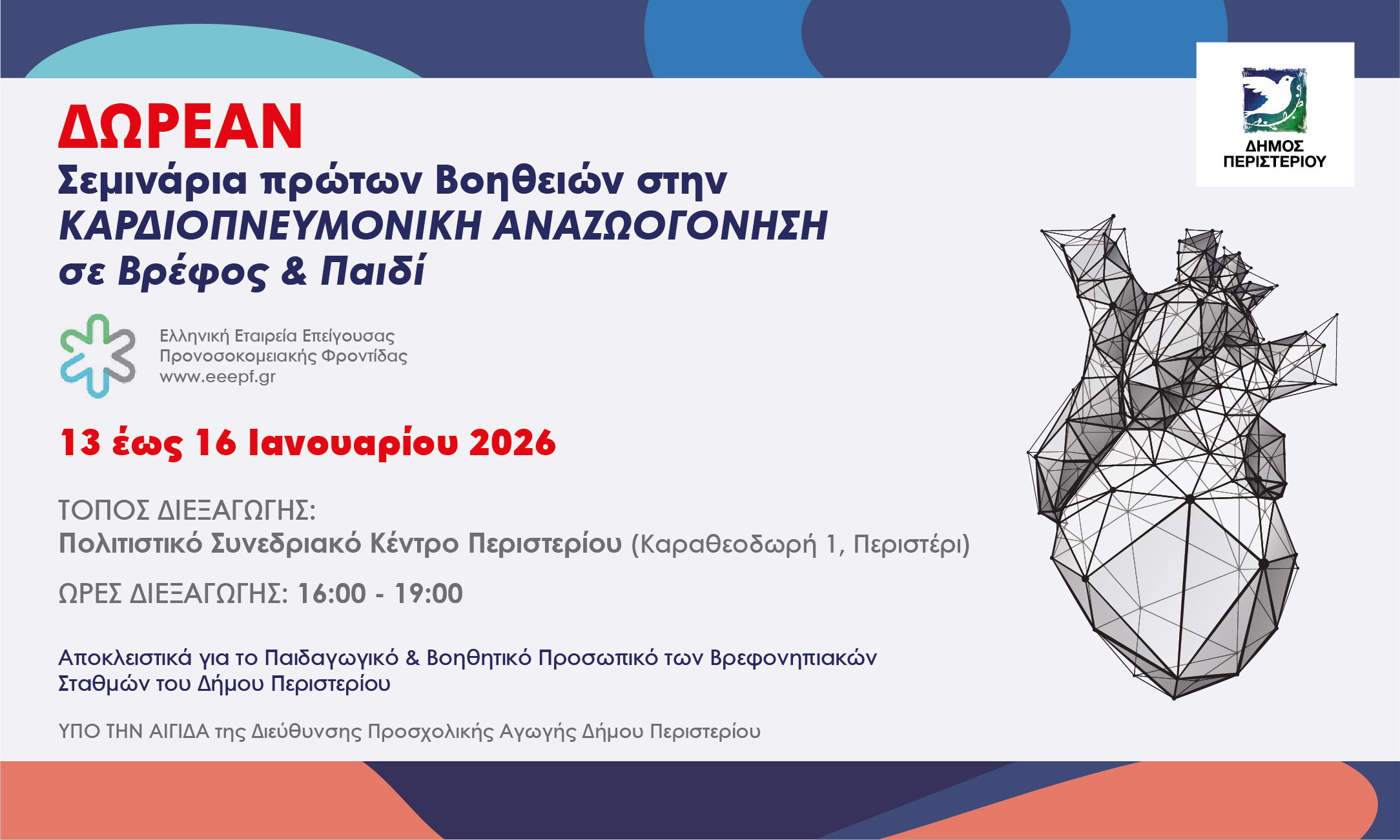 Το σεμινάριο θα πραγματοποιηθεί από 13 έως και 16 Ιανουαρίου 2026, στην Αίθουσα Πολλαπλών Χρήσεων του Δημαρχιακού Μεγάρου Περιστερίου, από την Ελληνική Εταιρεία Επείγουσας Προνοσοκομειακής Φροντίδας(ΕΕΕΠΦ), σε συνεργασία με τη νοσηλεύτρια κα Φραντζή, υπάλληλο της Διεύθυνσης Προσχολικής Αγωγής.