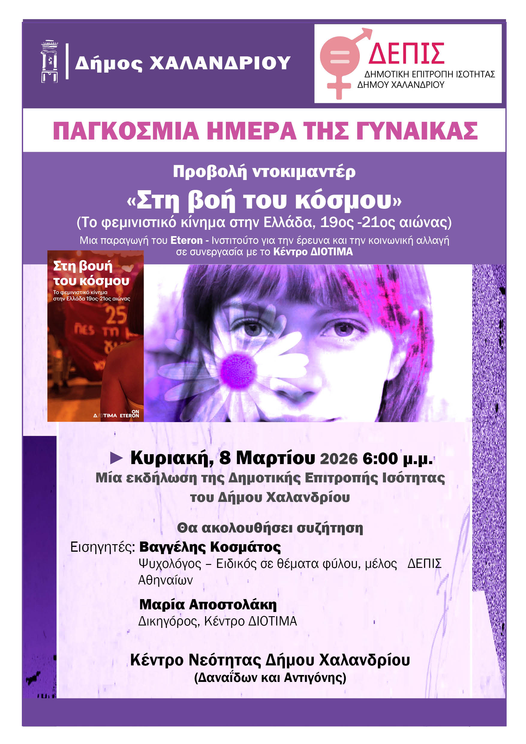 Η Δημοτική Επιτροπή Ισότητας του Δήμου Χαλανδρίου (ΔΕΠΙΣ) προβάλει το ντοκιμαντέρ «Στη βοή του κόσμου: Το φεμινιστικό κίνημα στην Ελλάδα, 19ος – 21ος αιώνας», την Κυριακή, 8 Μαρτίου 2026, στις 6:00′ μ.μ., στο Κέντρο Νεότητας του Δήμου Χαλανδρίου (Δαναΐδων και Αντιγόνης), με αφορμή την Παγκόσμια Ημέρα της Γυναίκας, στις 8 Μάρτη.