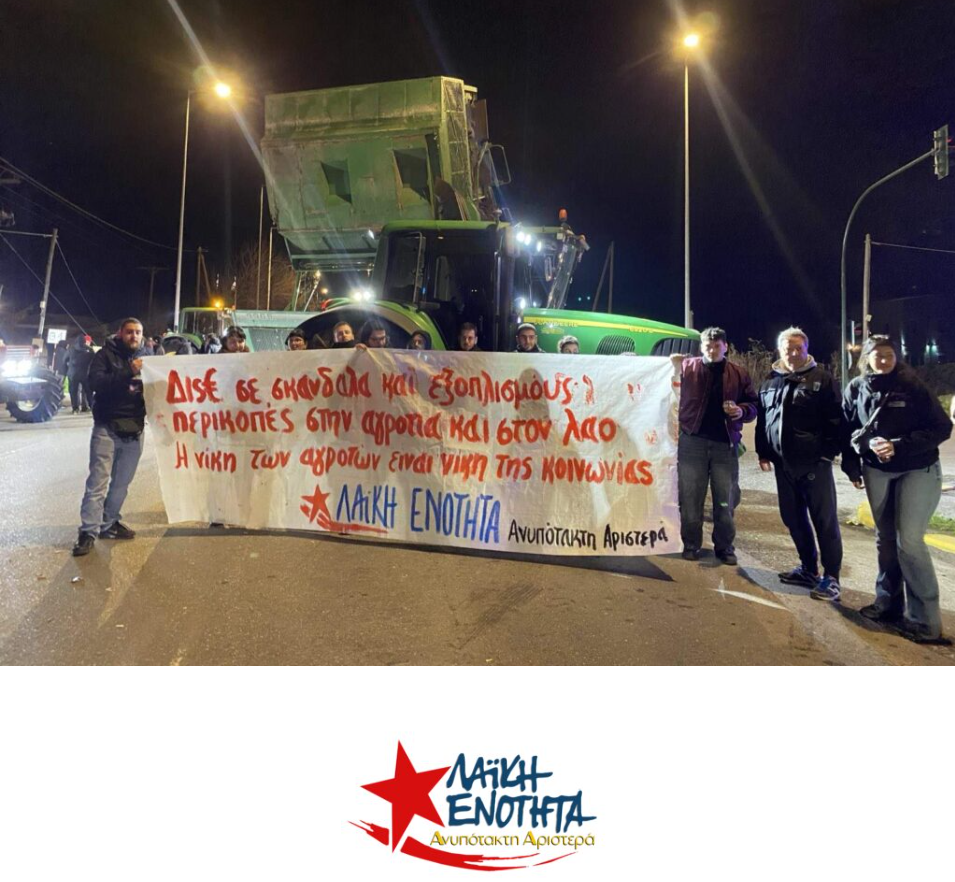 Στο αγροτικό μπλόκο του Κιλελέρ βρέθηκε αντιπροσωπεία της Λαϊκής Ενότητας – Α.Α. για να εκφράσει τη συμπαράσταση της στο δίκαιο αγώνα τους. “Ο αγώνας των αγροτών είναι αγώνας όλης της κοινωνίας”, αναφέρει η σχετική ανακοίνωση του κόμματος.
