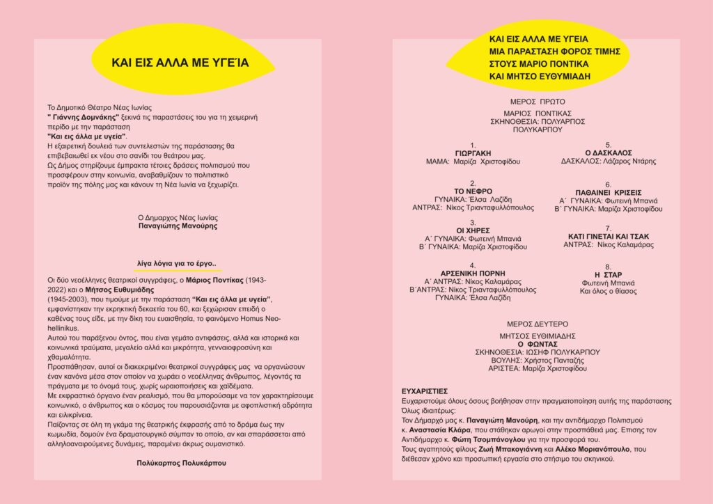 Το Δημοτικό Θέατρο Νέας Ιωνίας “Γιάννης Δομνάκης” ξεκινά τις παραστάσεις του για τη χειμερινή περίοδο με την παράσταση“Και εις άλλα με υγεία”.