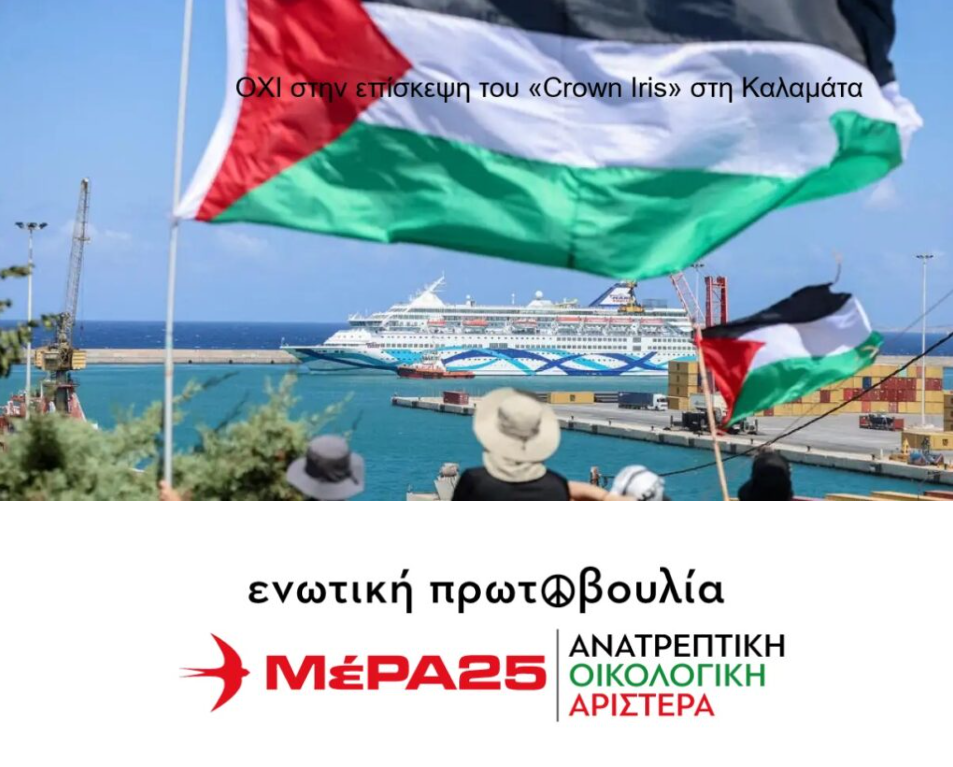 Η Ενωτική Πρωτοβουλία ΜέΡΑ25| Ανατρεπτική Οικολογική Αριστερά Μεσσηνίας στηρίζει την κινητοποίηση των πολιτών της Καλαμάτας, ενάντια στην άφιξη και παρουσία του Ισραηλινού κρουαζιερόπλοιου “CROWN IRIS” την Τρίτη 28 Οκτωβρίου στο λιμάνι της Καλαμάτας .