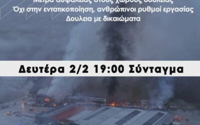 Συγκέντρωση διαμαρτυρίας για το εργατικό δυστύχημα στη «Βιολάντα» διοργανώνουν πρωτοβάθμια σωματεία, εργατικές συλλογικότητες (όπως η Αγωνιστική Ταξική Ενότητα ΕΚΑ) και πολιτικές οργανώσεις στην Αθήνα τη Δευτέρα 2/2 στις 7.00 μ.μ., στο Σύνταγμα. Σε σχετικό κάλεσμά τους αναφέρουν πως «τα εργοδοτικά εγκλήματα δεν είναι «ατυχήματα» και καλούν σε αγώνα ενάντια στην εργοδοτική αυθαιρεσία και τις συνθήκες … Συνεχίστε να διαβάζετε το Συγκέντρωση στο Σύνταγμα για το δυστύχημα στη «Βιολάντα».
