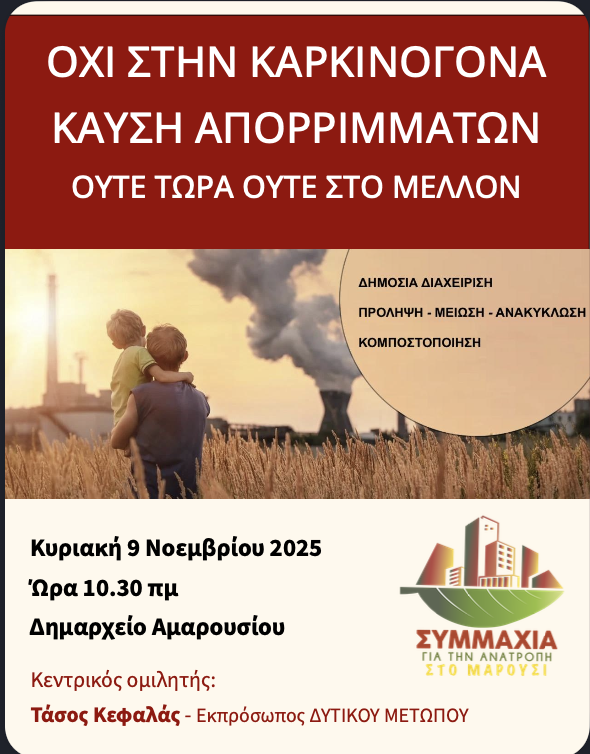 Την Κυριακή 9-11-2025 και ώρα 10.30 π.μ στο δημαρχείο Αμαρουσίου η Συμμαχία για την Ανατροπή στο Μαρούσι πραγματοποιεί εκδήλωση – συζήτηση για τη σχεδιαζόμενη από το ΥΠΕΝ κατασκευή 6 εργοστασίων καύσης απορριμμάτων.