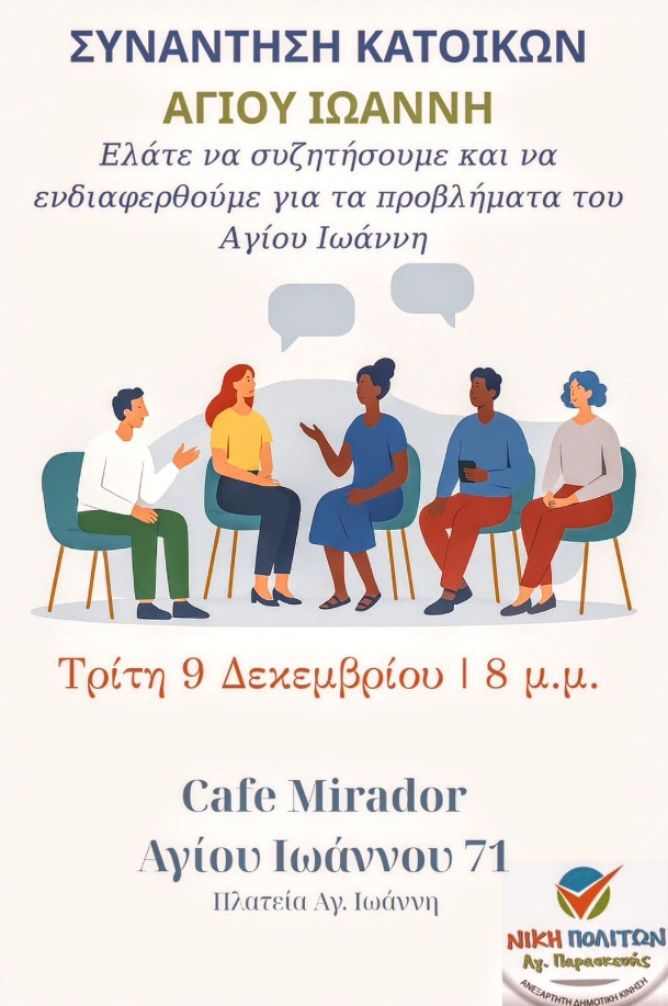 Με αφορμή τη συζήτηση του προϋπολογισμού του 2026 του Δήμου Αγίας Παρασκευής, η «Νίκη Πολιτών» διοργανώνει συνάντηση – συζήτηση τους κατοίκους της περιοχής του Αγίου Ιωάννη, την Τρίτη 9 Δεκεμβρίου, στις 20:00, στο καφέ Mirador, οδός Αγ. Ιωάννου 71, Πλατεία Αγ. Ιωάννη.