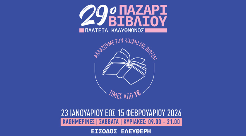 Το 29ο Παζάρι Βιβλίου 2026 λειτουργεί καθημερινές, Σάββατα και Κυριακές από τις 09:00 το πρωί έως και τις 21:00 το βράδυ, από 23 Ιανουαρίου έως και 15 Φεβρουαρίου 2026.