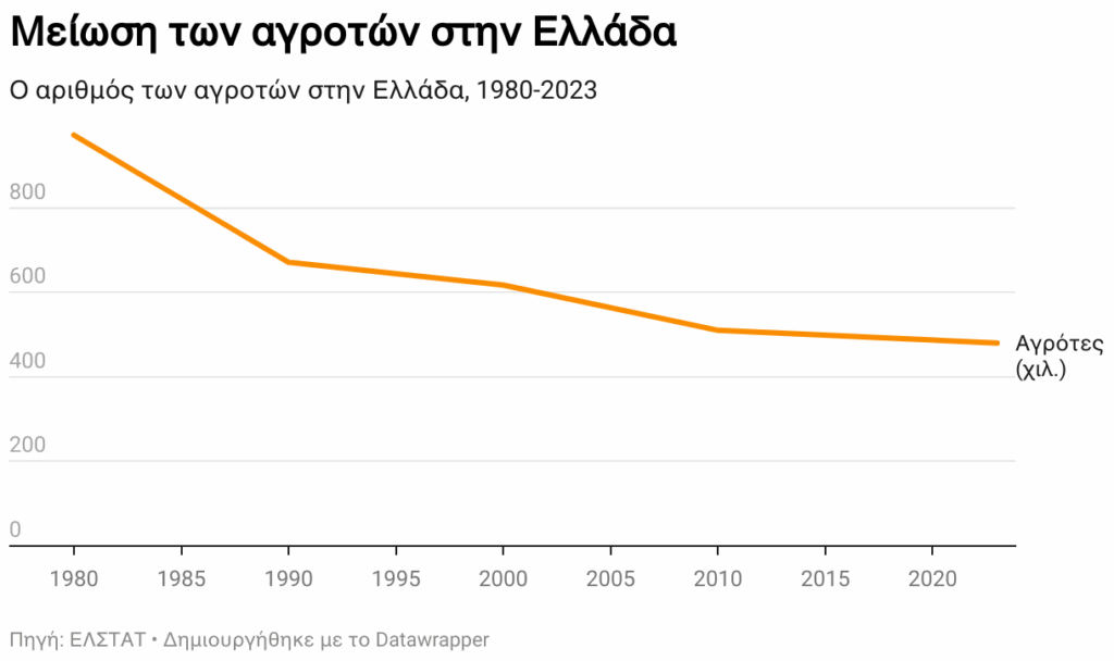 Όπως εξηγεί, ο πρωτογενής τομέας βρίσκεται σε οριακή κατάσταση εδώ και πολλά χρόνια. Με παράπονο, σχολιάζει τη μεγάλη μείωση του αγροτικού πληθυσμού. Με βάση τα στοιχεία της ΕΛΣΤΑΤ ο αριθμός των ατόμων που εργάζονται στον αγροτικό τομέα έχει μειωθεί κατά περισσότερο από 20% από το 2000 έως το 2023. Αυτό φυσικά συμβάλλει και στη δημογραφική κατάρρευση της υπαίθρου, καθώς οι επαγγελματίες του κλάδου αναγκάζονται να αναζητήσουν εργασία στα αστικά κέντρα.