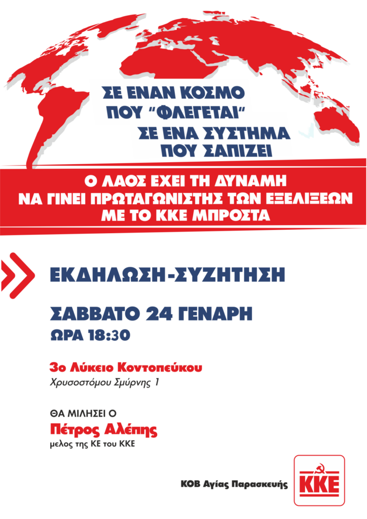«Σε έναν κόσμο που “φλέγεται” σε ένα σύστημα που σαπίζει ο λαός έχει τη δύναμη να γίνει πρωταγωνιστής των εξελίξεων με το ΚΚΕ μπροστά», το θέμα της εκδήλωσης που διοργανώνει η Κομματική Οργάνωση Βάσης (ΚΟΒ) Αγίας Παρασκευής του ΚΚΕ.