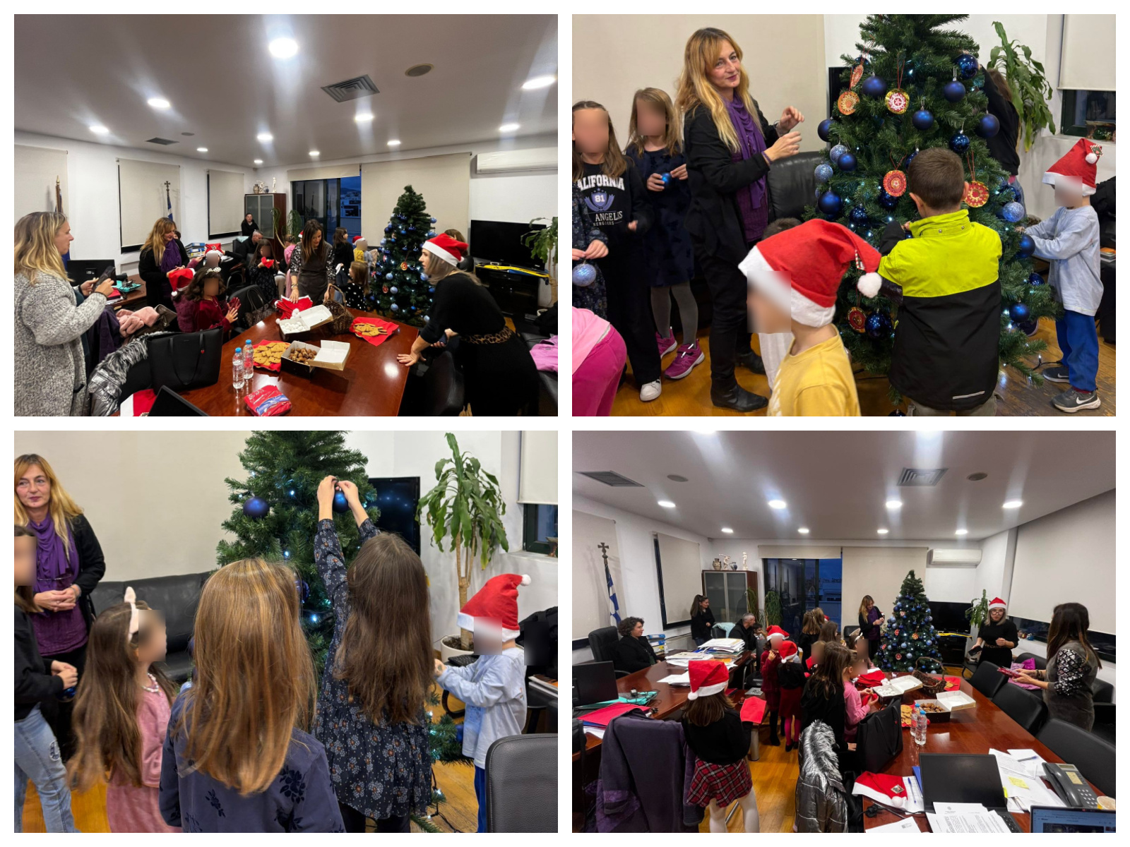 Τα παιδιά και οι γονείς απόλαυσαν χριστουγεννιάτικα εδέσματα, τραγούδησαν και στόλισαν το δέντρο με γιορτινές μελωδίες. Το Τμήμα Εικαστικών με υπεύθυνη την κα Δήμητρα Τζώτζιου δημιούργησε χειροποίητα στολίδια ειδικά για τον Δήμαρχο. Η τάξη πιάνου της κας Αλεξάνδρας Δαζέα προσέφερε μια όμορφη χριστουγεννιάτικη πλακέτα.