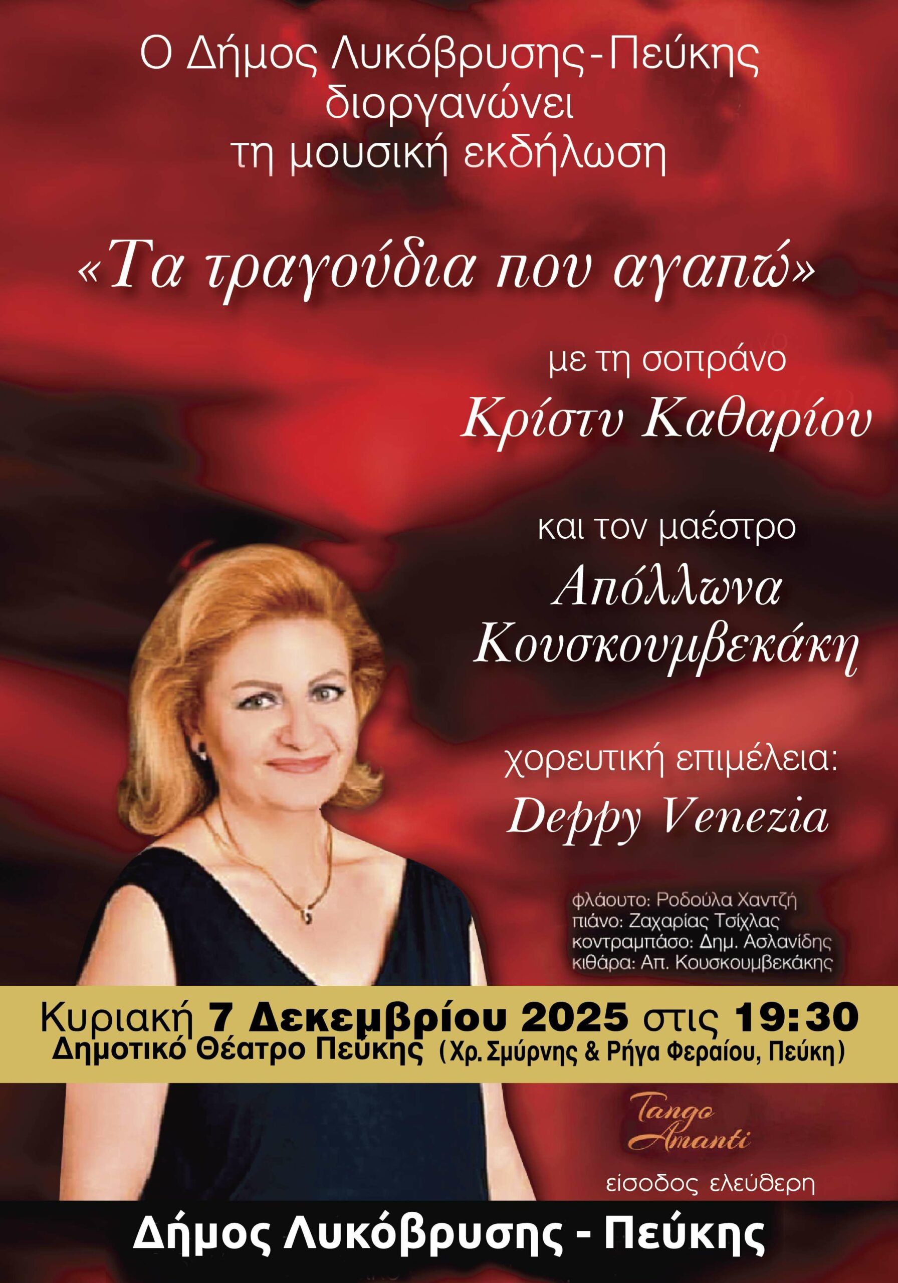 Ο Δήμος Λυκόβρυσης – Πεύκης διοργανώνει εορταστική μουσική βραδιά με τον τίτλο “Τα τραγούδια που αγαπώ” με τη συμμετοχή του μαέστρου Απόλλωνα Κουσκουμβεκάκη και της σοπράνο Κρίστυς Καθαρίου. Η εκδήλωση θα λάβει χώρα την Κυριακή, 7 Δεκεμβρίου 2025 και ώρα 7.30′ μ.μ. στο Δημοτικό Θέατρο Πεύκης (Χρυσοστόμου Σμύρνης και Ρήγα Φεραίου).