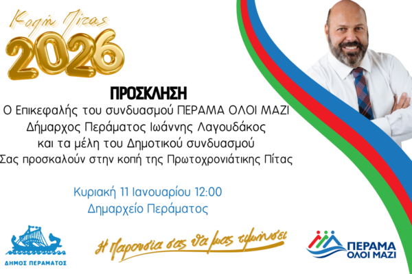 Η Δημοτική Αρχή του Δήμου Περάματος και η Παράταξη “Πέραμα Όλοι Μαζί” του Δημάρχου της πόλης, Γ. Λαγουδάκου, κόβουν την πίτα της νέας χρονιάς. Η εκδήλωση θα πραγματοποιηθεί την Κυριακή, 11 Ιανουαρίου 2026, στις 12.00′ στο Δημαρχείο Περάματος.