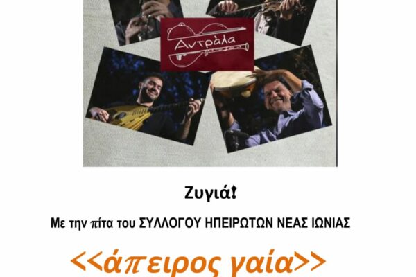 Κόβει την πίτα του ο Σύλλογος Ηπειρωτών Ν. Ιωνίας “Άπειρος Γαία”. Η εκδήλωση θα πραγματοποιηθεί το Σάββατο, 31 Ιανουαρίου 2026 και ώρα 6.30′ μ.μ., στο Συνεδριακό Κέντρο Ν. Ιωνίας (Πατριάρχου Ιωακείμ 4, Νέα Ιωνία), ενώ θα συνοδευτεί από ηπειρώτικο γλέντι με χορό και τραγούδι με τη ΖΥΓΙΑ “Αντράλα” και τον Γιάννη Κουτελέκο, αντίστοιχα, συνοδεία πολλών…