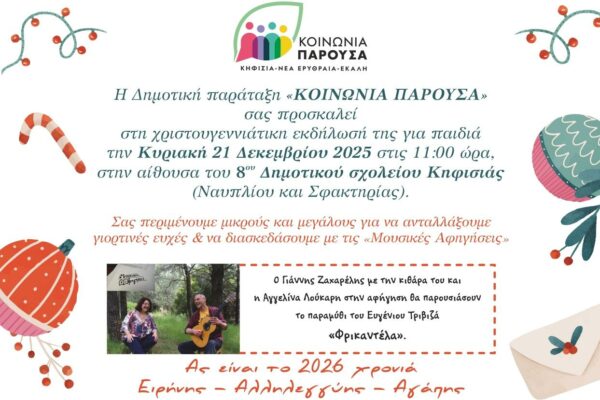 Χριστουγεννιάτικη εκδήλωση για παιδιά διοργανώνει η Δημοτική Παράταξη “Κοινωνία Παρούσα στην Κηφισιά, Νέα Ερυθραία, Εκάλη”. Η εκδήλωση θα πραγματοποιηθεί την Κυριακή 21 Δεκεμβρίου 2025 και ώρα 11.00‘ π.μ. στην αίθουσα εκδηλώσεων του 8ου Δημοτικού Σχολείου Κηφισιάς (Ναυπλίου και Σφακτηρίας). Αναλυτικά, η ανακοίνωση – πρόσκληση της “Κοινωνία Παρούσα στην Κηφισιά, Νέα Ερυθραία, Εκάλη” έχει ως εξής:…