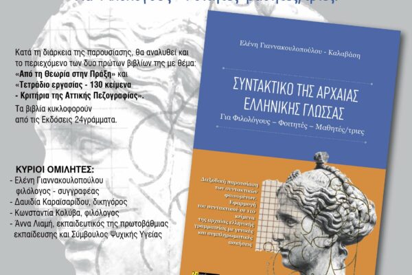 Ομιλία με θέμα “Η Δομή της Ελληνικής Γλώσσας”, σε συνδυασμό και με την παρουσίαση του βιβλίου της φιλολόγου – συγγραφέα, Ελένης Γιαννακουλοπούλου – Καλαβάση με θέμα: “Συντακτικό της Αρχαίας Ελληνικής Γλώσσας Για Φιλολόγους – Φοιτητές- μαθητές / τριες” πραγματοποιείται στην Αίθουσα Μ. Αναγνωστάκης, στην Πεύκη. Η εκδήλωση θα λάβει χώρα το Σάββατο, 7 Φεβρουαρίου 2026…