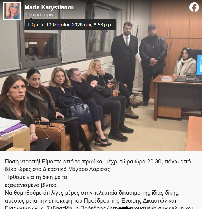 Θα συνεχίσει το μπάζωμα όπως ακριβώς γίνεται κατά παράδοση σε αυτό το κτίριο. Θεωρούμε, λοιπόν, εγώ σαν πολίτης, ότι εδώ πέρα μέσα υπάρχει μία οργάνωση όπου ο ένας συγκαλύπτει τον άλλον, και επομένως πραγματικά θεωρώ ότι η δίκη θα πρέπει οπωσδήποτε να φύγει από το δικαστικό μέγαρο Λάρισας και να πάει κάπου αλλού, να έχουμε μεγαλύτερες πιθανότητες για να βρούμε την αλήθεια για τα παιδιά μας», σημείωσε η Μαρία Καρυστιανού.