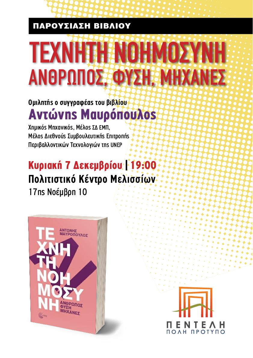 Η Δημοτική Παράταξη “Πεντέλη Πόλη Πρότυπο” πραγματοποιεί την παρουσίαση του βιβλίου “Τεχνητή Νοημοσύνη: Άνθρωπος, Φύση, Μηχανές” του χημικού μηχανικού Αντώνη Μαυρόπουλου. Η εκδήλωση θα λάβει χώρα την Κυριακή, 7 Δεκεμβρίου 2025, στις 7.00′ μ.μ., στο Πολιτιστικό Κέντρο Μελισσίων.