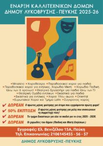 Σε πλήρη λειτουργία βρίσκονται όλα τα καλλιτεχνικά εργαστήρια του Δήμου Λυκόβρυσης – Πεύκης, όπως ενημερώνει η σχετική ανακοίνωση του γραφείου τύπου. Οι εγγραφές συνεχίζονται και
