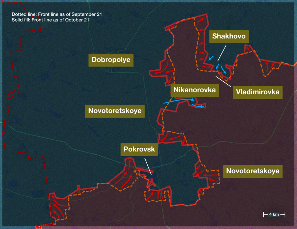 Ως αποτέλεσμα, το Ποκρόφσκ καταλήφθηκε σχεδόν πλήρως μέχρι τον Οκτώβριο. Η περιοχή νότια της σιδηροδρομικής γραμμής έπεσε πρώτη, ακολουθούμενη από τις πολυκατοικίες στις βόρειες περιοχές της πόλης.