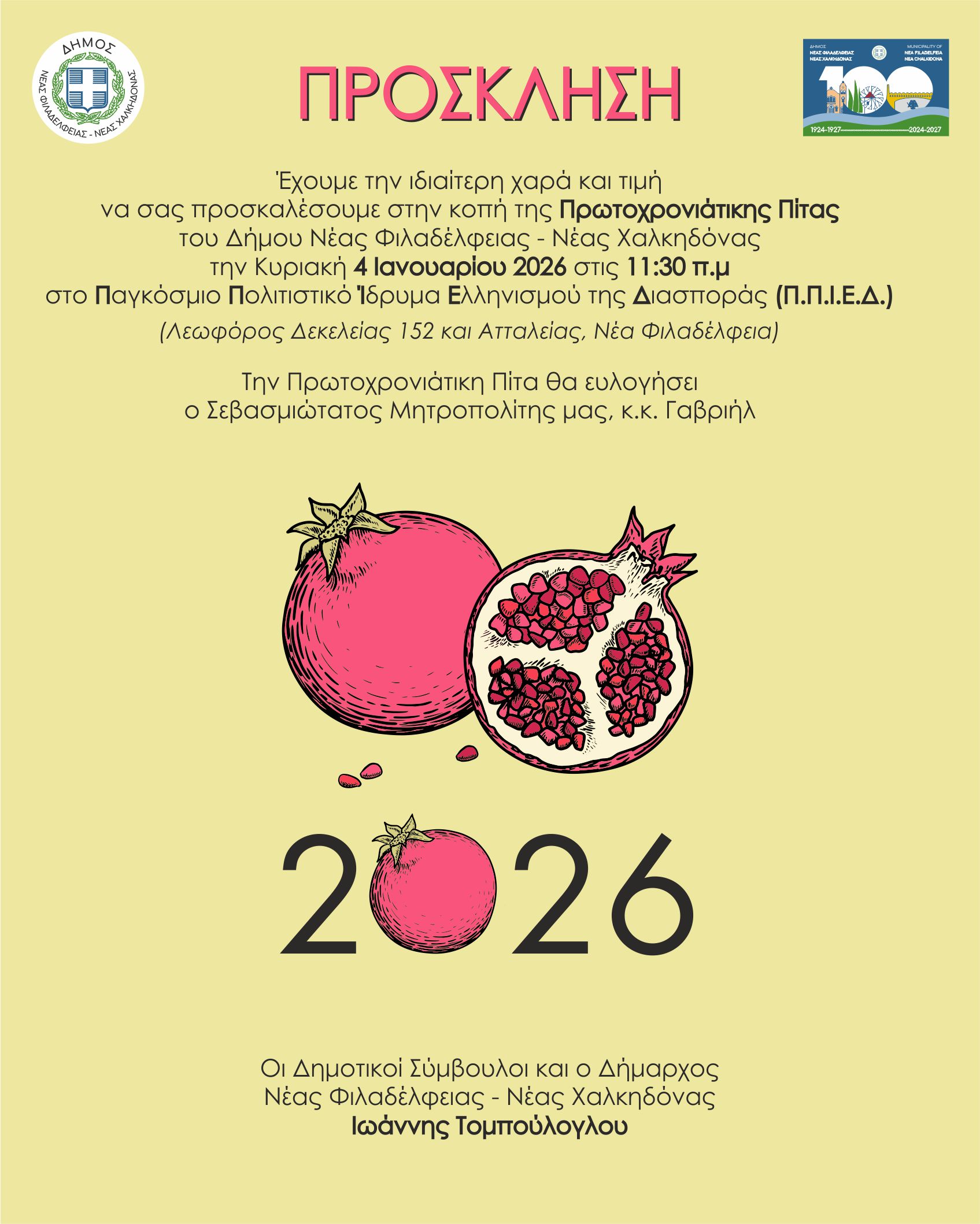 Την Κυριακή 4 Ιανουαρίου 2026 και ώρα 11:30′ π.μ. θα πραγματοποιηθεί η εκδήλωση για την κοπή της Πρωτοχρονιάτικης Πίτας του Δήμου μας, στο Παγκόσμιο Πολιτιστικό Ίδρυμα Ελληνισμού της Διασποράς (Π.Π.Ι.Ε.Δ.), Λεωφ. Δεκελείας 152 και Ατταλείας, Νέα Φιλαδέλφεια.