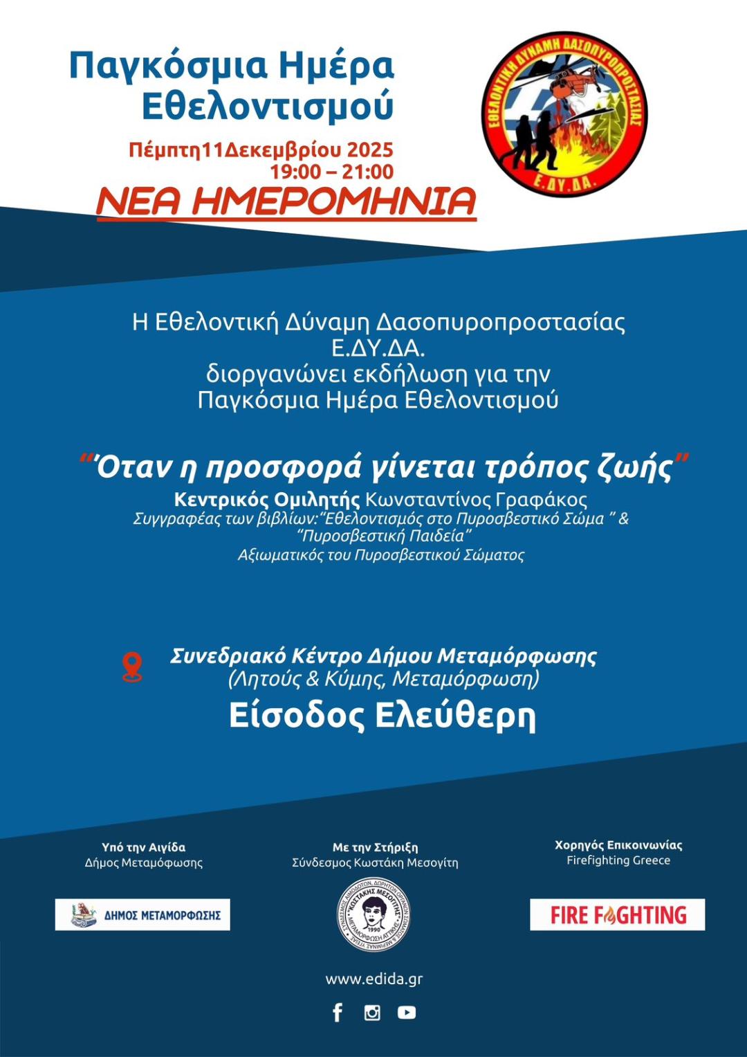 Την Πέμπτη, 11 Δεκεμβρίου 2025, θα πραγματοποιηθεί η εκδήλωση για τον εθελοντισμό της Ελληνικής Δύναμης Δασοπροστασίας, η οποία είχε αναβληθεί λόγω κακοκαιρίας. Η εκδήλωση γίνεται με αφορμή την Παγκόσμια Ημέρα Εθελοντισμού σε συνεργασία με τον Δήμο Μεταμόρφωσης και τον Σύλλογο Εθελοντών Αιμοδοτών και Δωρητών Οργάνων και Μυελού των Οστών “Κωστάκης Μεσογίτης” και θα λάβει χώρα στο Συνεδριακό Κέντρο του Δήμου Μεταμόρφωσης (Κύμης και Λητούς, Κτήμα Δηλαβέρη), από τις 7.00′ μ.μ. έως στις 9.00′ μ.μ..