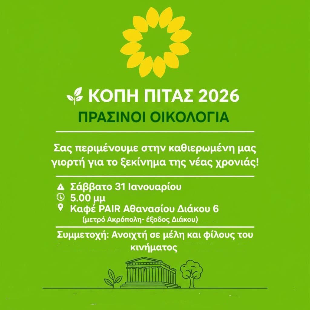 Την πίτα τους κόβουν σήμερα, Σάββατο 31 Ιανουαρίου 2026, οι Πράσινοι – Οικολογία Αττικής. Η εκδήλωση θα λάβει χώρα στο Καφέ Pair – Αθανασίου Διάκου 6 (μετρό Ακρόπολη- έξοδος Διάκου), στις 5.00′ μ.μ.
