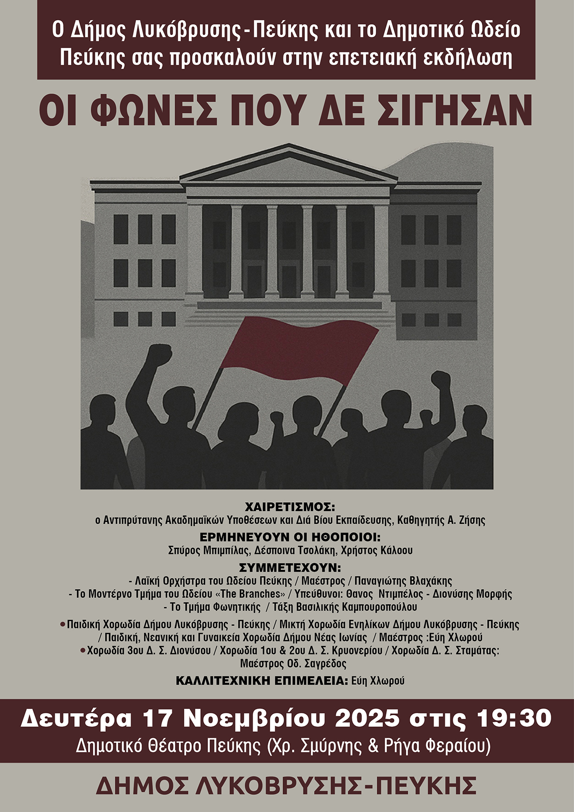 Τη Δευτέρα, 17 Νοεμβρίου 2025 και ώρα 19:30, ο Δήμος Λυκόβρυσης – Πεύκης και το Δημοτικό Ωδείο Πεύκης διοργανώνουν στο Δημοτικό Θέατρο Πεύκης (Χρυσοστόμου Σμύρνης & Ρήγα Φεραίου) την επετειακή εκδήλωση «Οι φωνές που δεν σίγησαν», αφιερωμένη στην Εξέγερση του Πολυτεχνείου και στους αγώνες για ελευθερία και δημοκρατία.
