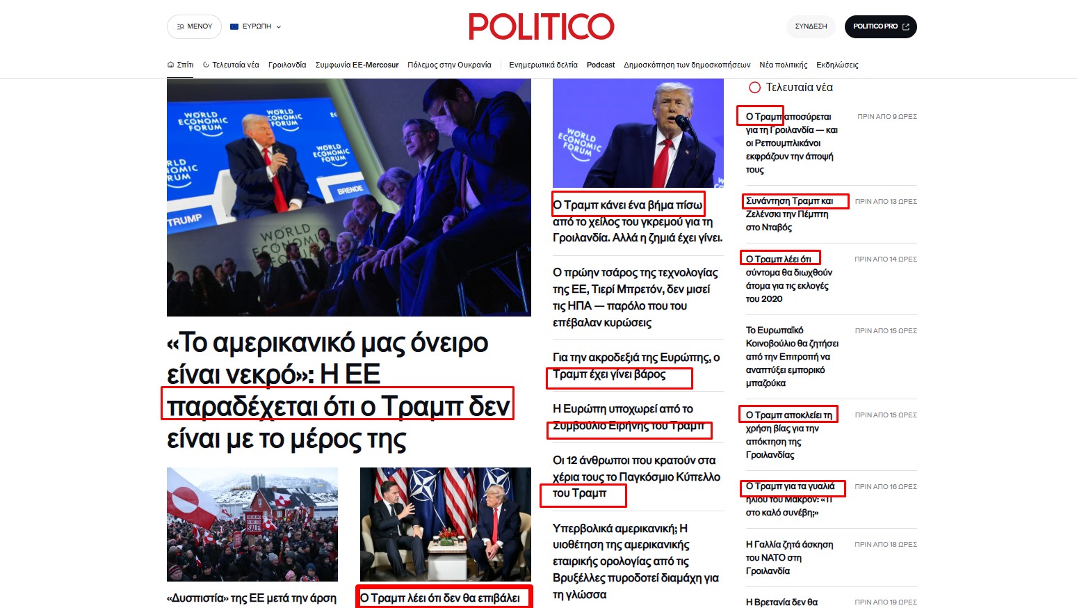 Το σημερινό πρωτοσέλιδο, δηλαδή η αρχική σελίδα, του politico.eu είναι αρκετό για να καταλάβει ο οποιοσδήποτε το σοκ που έχουν υποστεί οι ευρωπαϊκές ηγεσίες από την επεκτατική πολιτική – σε βάρος τους – που ακολουθεί ο Ντόναλντ Τραμπ.