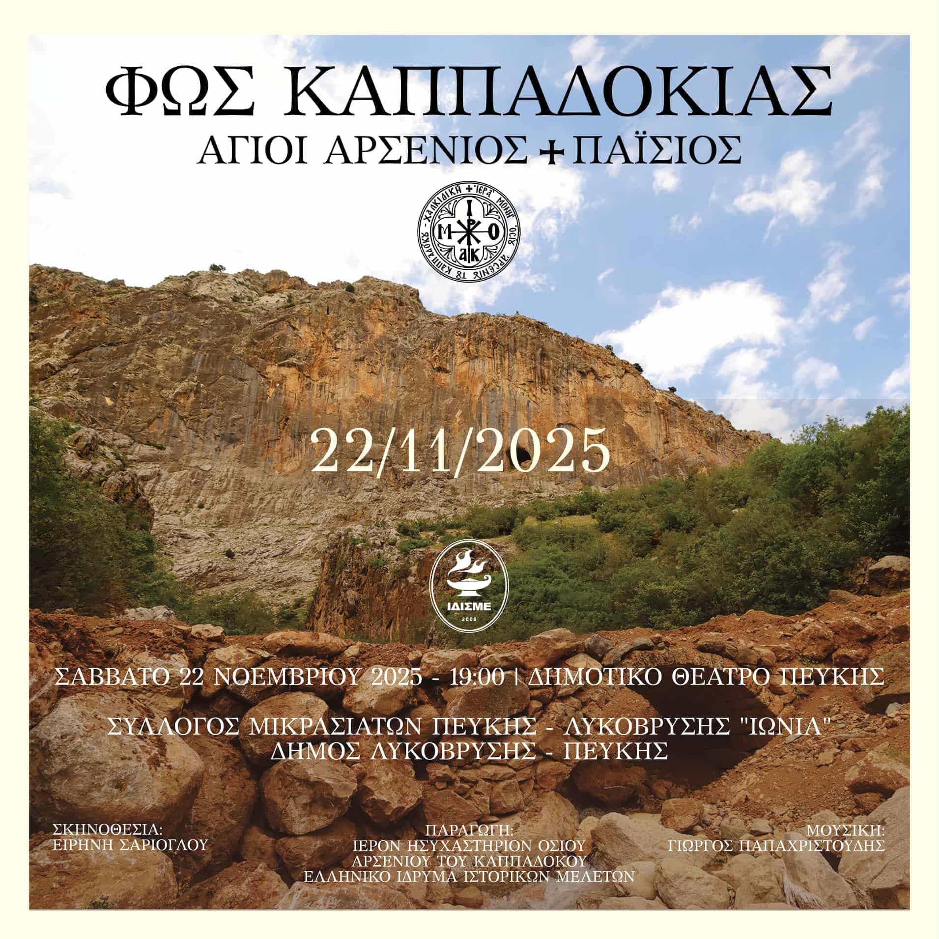 Ο Σύλλογος Μικρασιατών Πεύκης-Λυκόβρυσης «Ιωνία», σε συνεργασία με τον Δήμο Λυκόβρυσης-Πεύκης, το Ιερόν Ησυχαστήριον Οσίου Αρσενίου του Καππαδόκου και το Ελληνικό Ίδρυμα Ιστορικών Μελετών (ΙΔ.ΙΣ.ΜΕ.), διοργανώνουν την προβολή του Ντοκιμαντέρ «Φως Καππαδοκίας» – Άγιος Αρσένιος & Άγιος Παΐσιος.