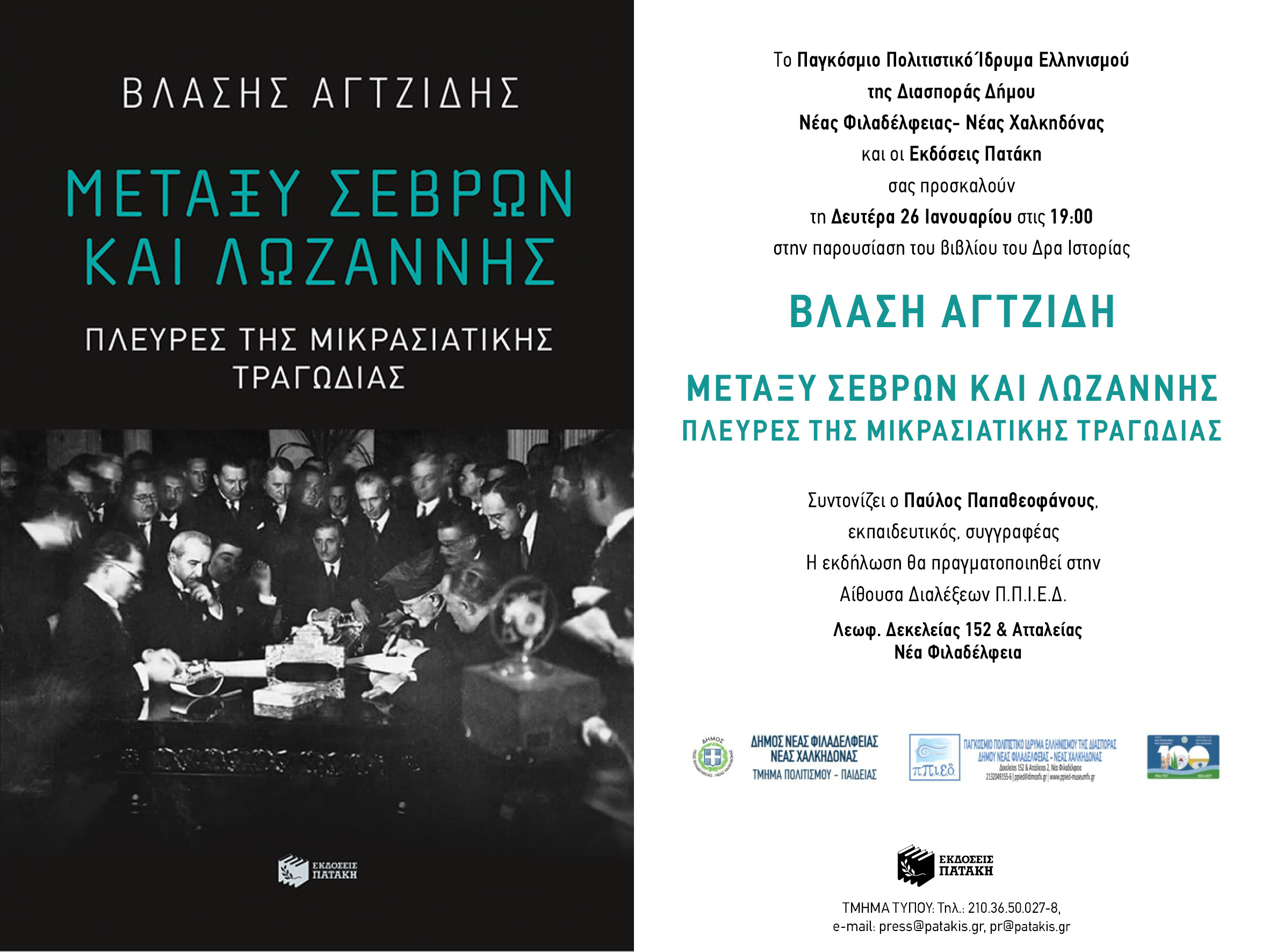 Το ΠΠΙΕΔ του Δήμου Νέας Φιλαδέλφειας – Νέας Χαλκηδόνας και οι Εκδόσεις Πατάκη παρουσιάζουν το βιβλίο του Δρα Ιστορίας Βλάση Αγτζίδη “Μεταξύ Σεβρών και Λωζάννης” – Πλευρές της Μικρασιατικής τραγωδίας. Η εκδήλωση θα λάβει χώρα τη, Δευτέρα 26 Ιανουαρίου 2026, στις 7.00′ μ.μ. στην αίθουσα εκδηλώσεων του ΠΠΙΕΔ.