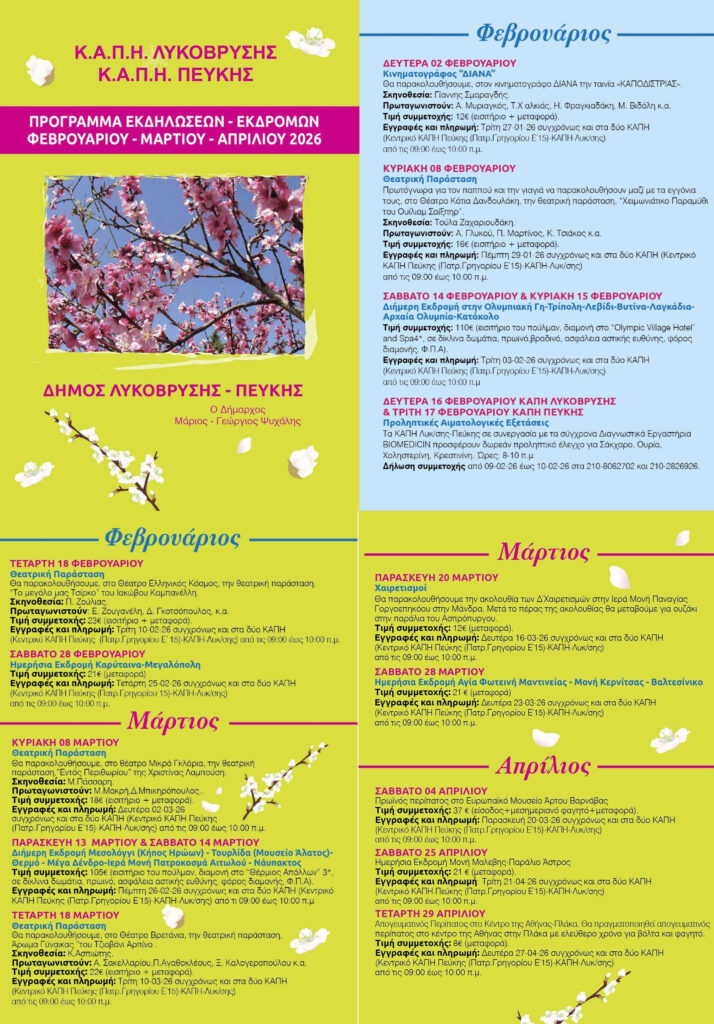 Ο Δήμος Λυκόβρυσης – Πεύκης, στο πλαίσιο της συνεχούς στήριξης και μέριμνας για την τρίτη ηλικία, ανακοινώνει το πρόγραμμα εκδηλώσεων και εκδρομών που διοργανώνονται από τα ΚΑΠΗ Λυκόβρυσης – Πεύκης για τους μήνες Φεβρουάριο, Μάρτιο και Απρίλιο 2026.