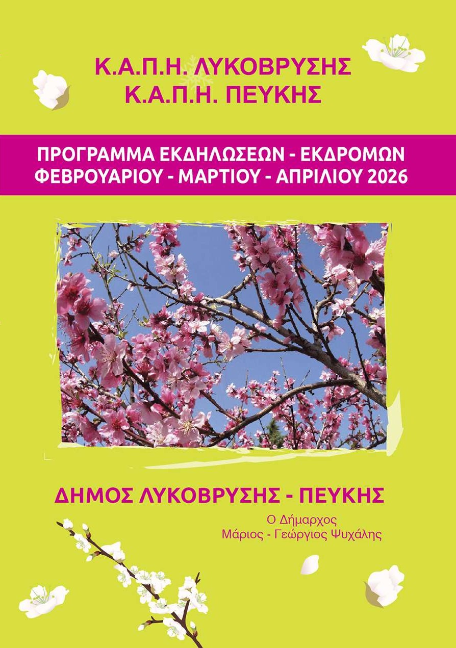 Ο Δήμος Λυκόβρυσης – Πεύκης, στο πλαίσιο της συνεχούς στήριξης και μέριμνας για την τρίτη ηλικία, ανακοινώνει το πρόγραμμα εκδηλώσεων και εκδρομών που διοργανώνονται από τα ΚΑΠΗ Λυκόβρυσης – Πεύκης για τους μήνες Φεβρουάριο, Μάρτιο και Απρίλιο 2026.
