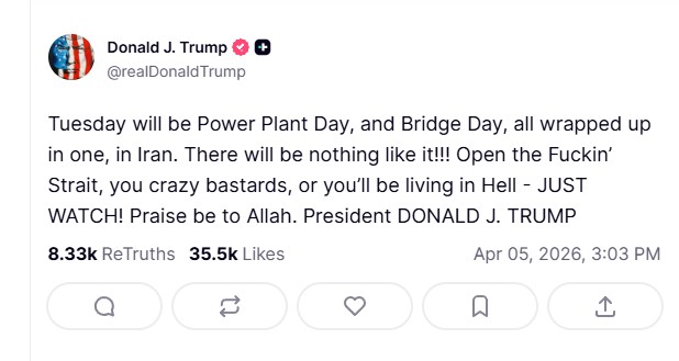Ο πρόεδρος των ΗΠΑ Ντόναλντ Τραμπ απείλησε ξανά το Ιράν, προειδοποιώντας για επικείμενες επιθέσεις σε βασικές υποδομές, απαιτώντας παράλληλα από την Τεχεράνη να ανοίξει ξανά το Στενό του Ορμούζ.