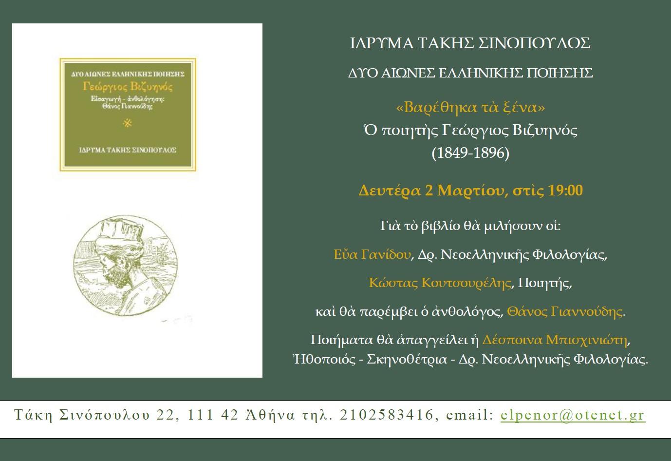 Στην παρουσίαση του βιβλίου για τον Γεώργιο Βιζυηνό “Βαρέθηκα τα ξένα” καλεί το Ίδρυμα “Τάκης Σινόπουλος”. Η εκδήλωση θα πραγματοποιηθεί τη Δευτέρα, 2 Μαρτίου 2026 και ώρα 7.00′ μ.μ. στο σπίτι του Τάκη Σινόπουλου (οδός Τάκη Σινόπουλου 22, Περισσός).