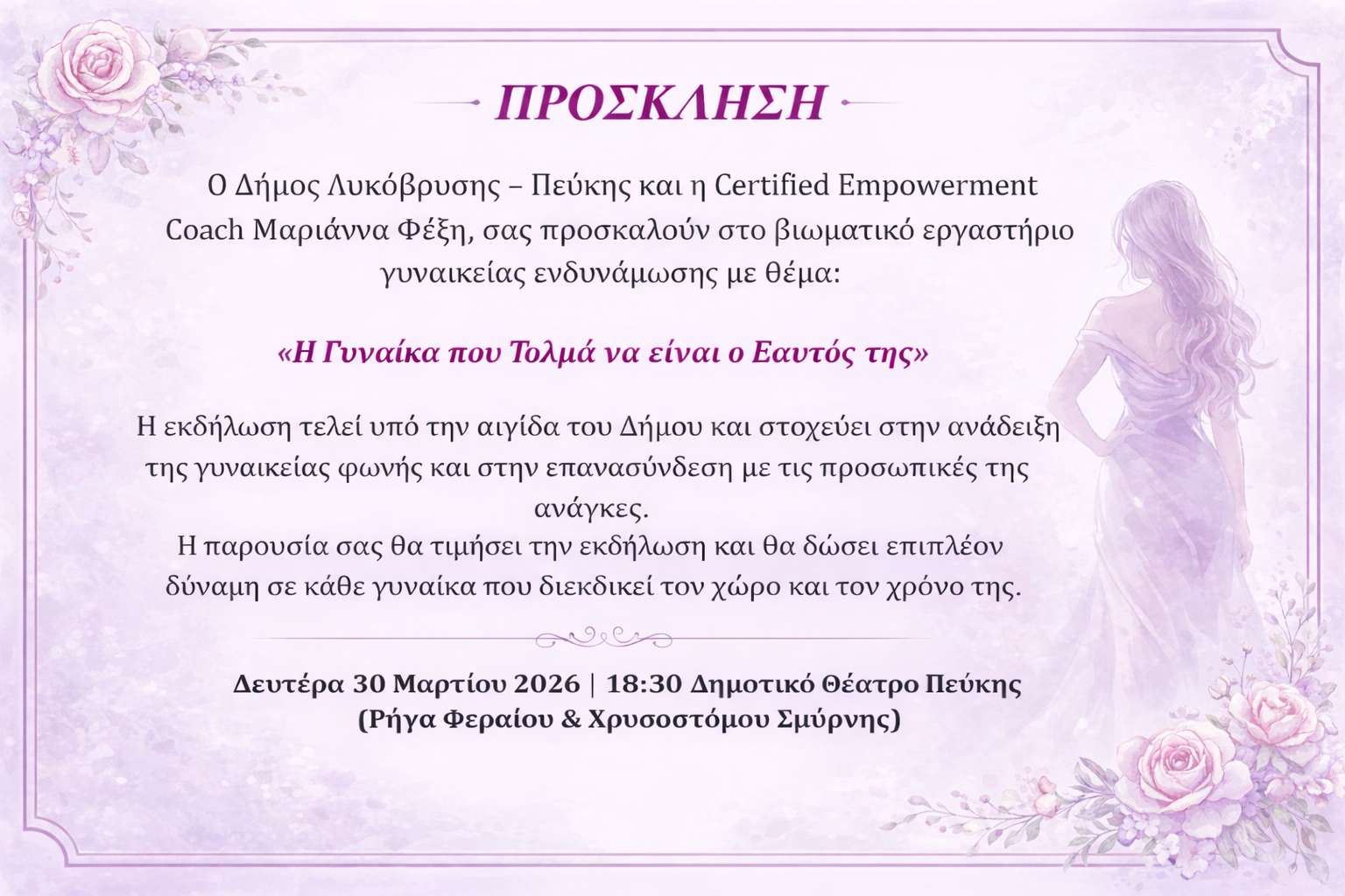 Ο Δήμος Λυκόβρυσης–Πεύκης, σε συνεργασία με την certified empowerment coach Μαριάννα Φέξη, διοργανώνει βιωματικό εργαστήριο γυναικείας ενδυνάμωσης με τίτλο «Η Γυναίκα που Τολμά να είναι ο Εαυτός της».