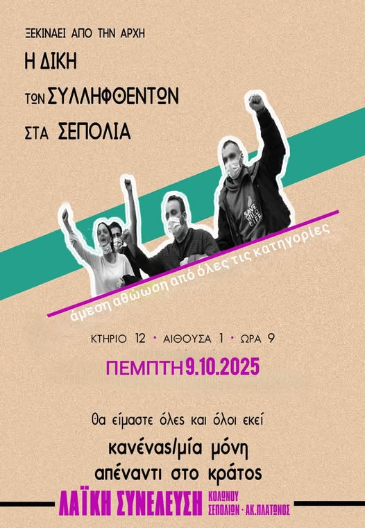 Καλούμε την Πέμπτη 9/10/2025 στις 9 πμ στα Δικαστήρια της Ευελπίδων στο κτίριο 12, αίθουσα 1»