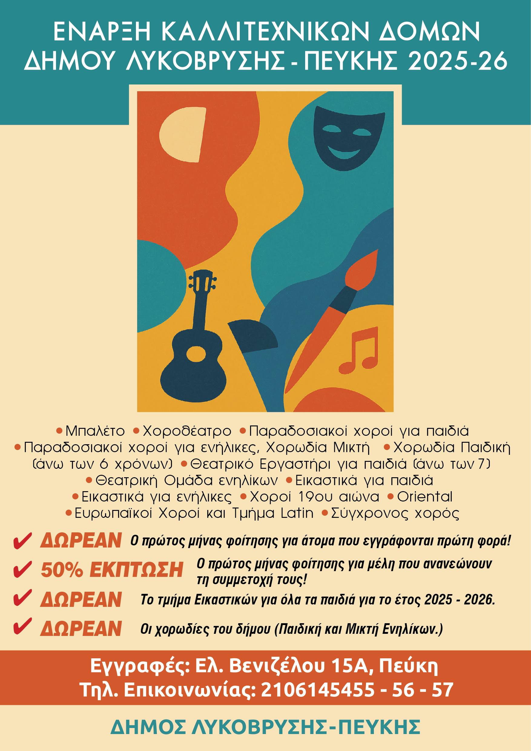 Ο Δήμος Λυκόβρυσης–Πεύκης ενημερώνει ότι όλα τα τμήματα των Καλλιτεχνικών Δομών για τη νέα πολιτιστική περίοδο 2025–2026 έχουν ήδη ξεκινήσει και λειτουργούν κανονικά. Με πλούσιο πρόγραμμα και αναβαθμισμένες δραστηριότητες, οι δομές μας συνεχίζουν να αποτελούν σημείο αναφοράς για τον πολιτισμό της πόλης.