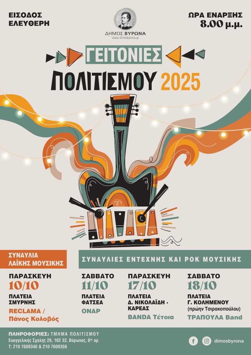 Οι πλατείες του Βύρωνα μετατρέπονται και φέτος σε ανοιχτές μουσικές σκηνές. Ο Δήμος Βύρωνα διοργανώνει τις «Γειτονιές Πολιτισμού 2025», μια σειρά από δωρεάν συναυλίες που θα πραγματοποιηθούν από τις 10 έως τις 18 Οκτωβρίου, με στόχο να φέρουν τη μουσική πιο κοντά στους δημότες και να δώσουν ζωή στις γειτονιές.